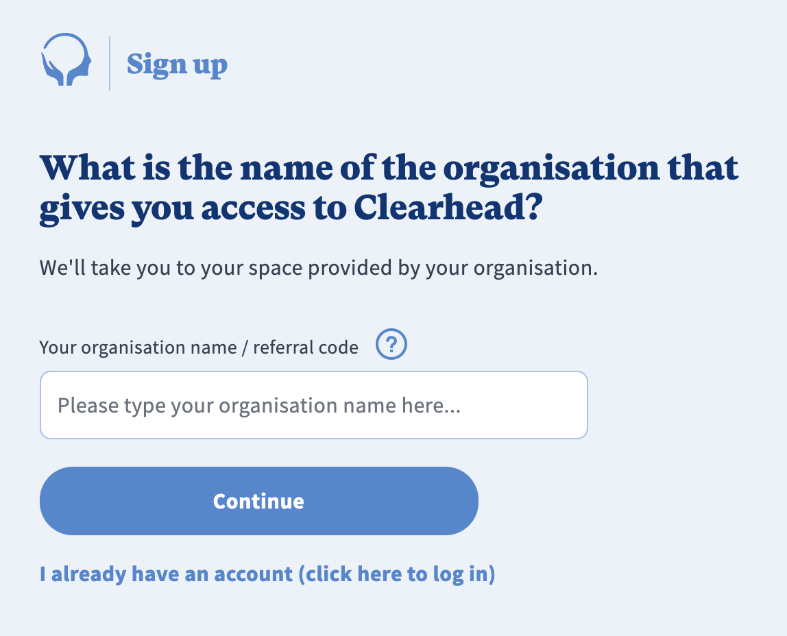 Make sure you signed up directly at your company's website (e.g. format: companyname.myclearhead.com), or after entering your organisation when prompted here on the app, or at myclearhead.com: