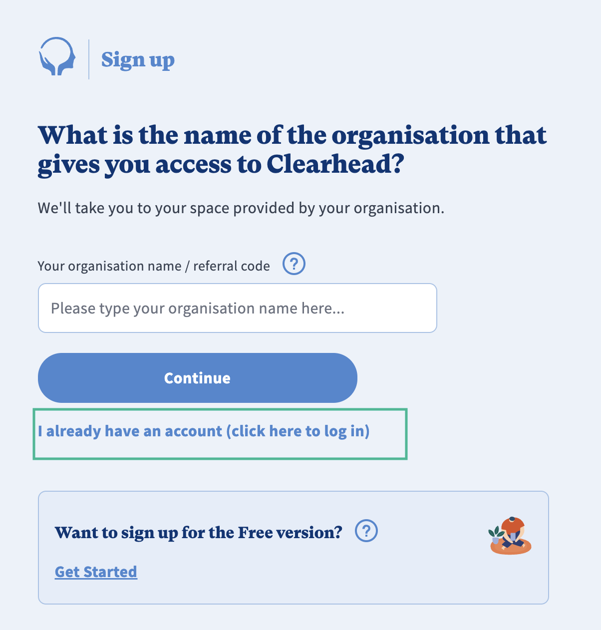 If you believe you signed up for a free account and didn't follow the previous steps initially, you will need to sign up again from your company's Clearhead website (e.g. format: companyname.myclearhead.com) or by entering your company name in the above step, and then verifying yourself using either your work email/email or ID.