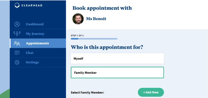 When asked ‘Who is this appointment for?’, click ‘Family Member’.