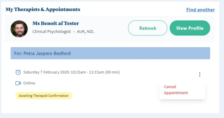 If you have retained permission to manage the family member’s bookings, when logged in, head to Appointments and scroll to My Therapists & Appointments.