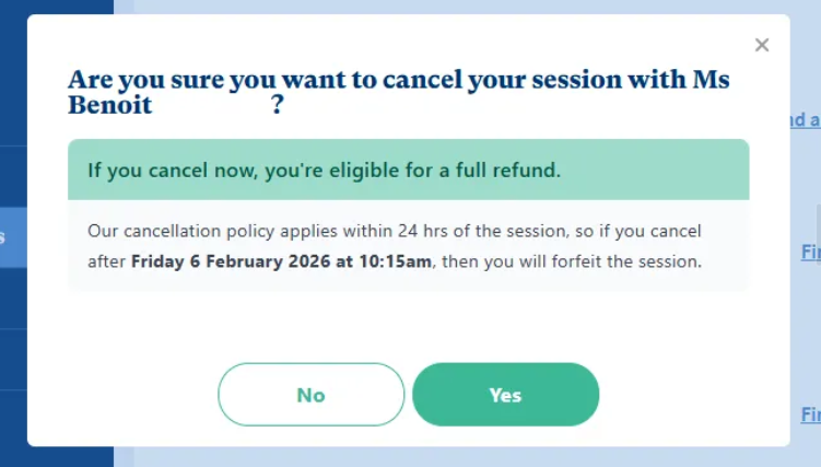 Ensure you cancel appointments 24 hours before the session is set to take place to avoid cancelllation fees/using EAP therapy allocation.