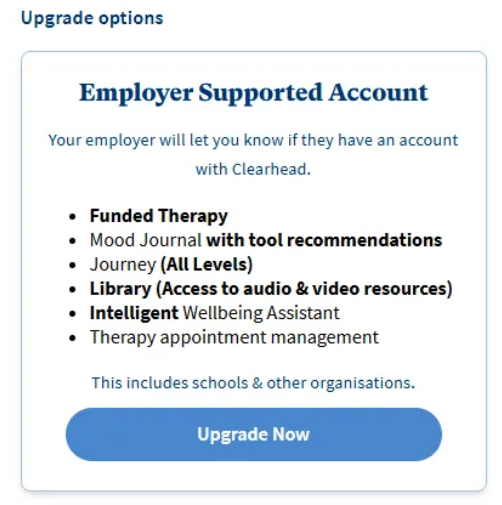 For example the following account has EAP funding under company ‘Demo’ of 4 sessions per year. You can also see if you are entitled to Family Support, Career Advisers, Financial Advisors and Legal Advisors through EAP funding.