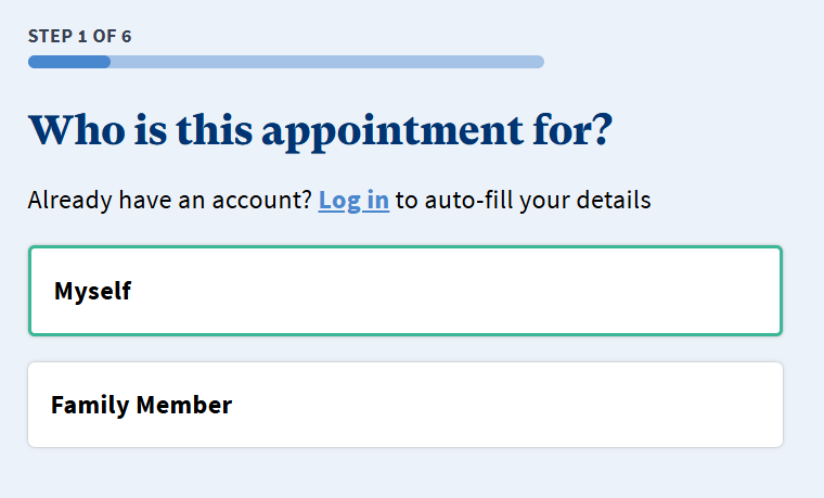 When asked, Who is this appointment for? select either 'Myself' or 'Family Member' and enter Contact Details.