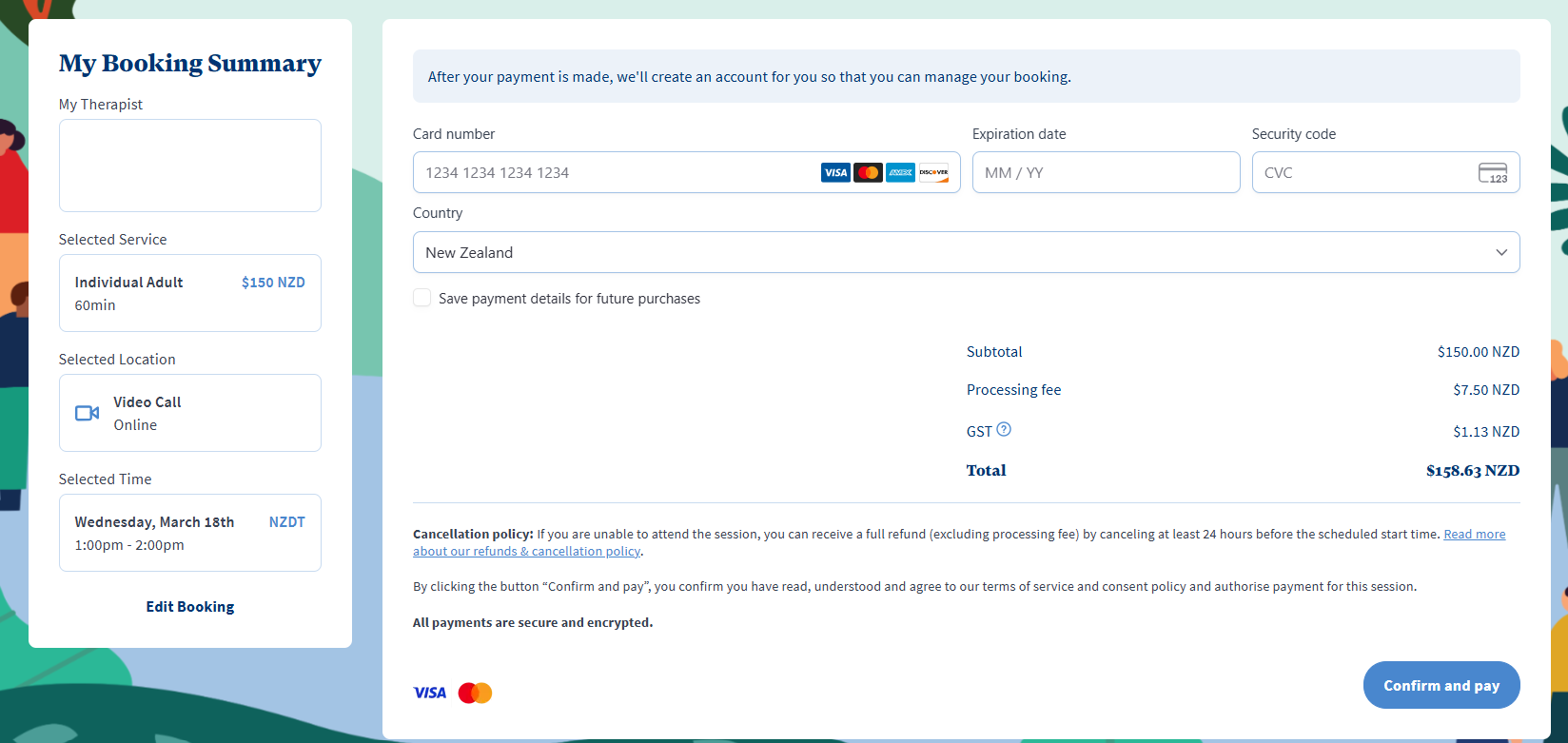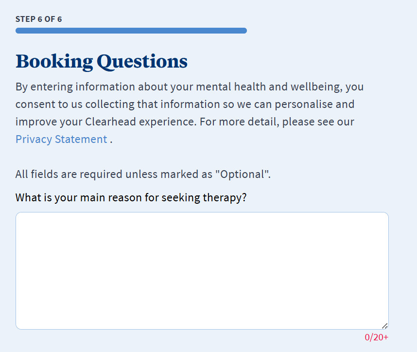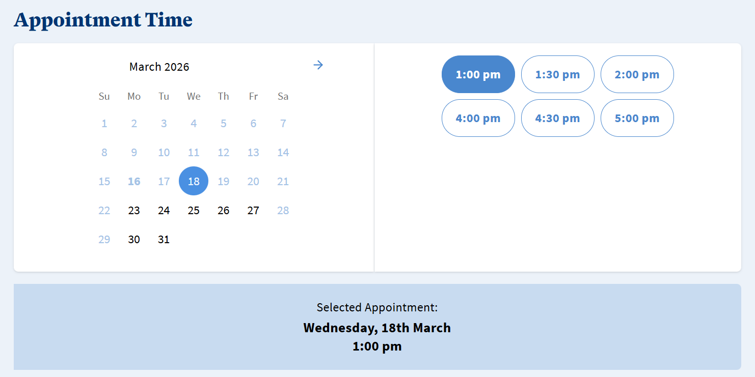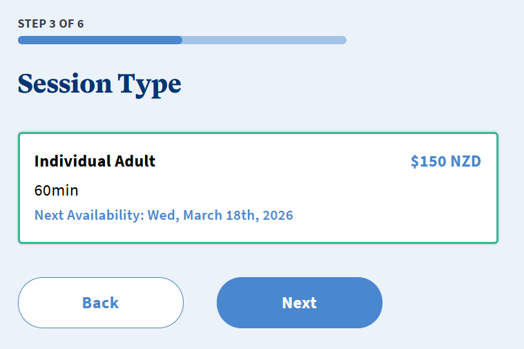 If the therapist has their calendar enabled, you can select your chosen Appointment Time and click ‘Next’. If they don't have their calendar enabled you will not see this step and they will reach out to you after a booking is requested to confirm the time.