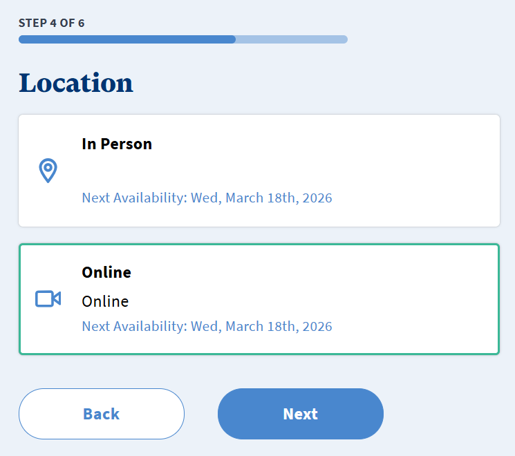 Select the Location either In Person or Online (depending on which locations your therapist has available) and click ‘Next’.